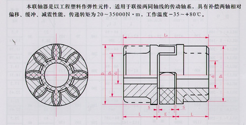 本聯(lián)軸器是以工程塑料作彈性元件,適用于聯(lián)接兩同軸線的傳動(dòng)軸系,具有補(bǔ)償兩軸相對(duì)偏移、緩沖、減震性能,傳遞轉(zhuǎn)矩為20——35000N.m,工作溫度-35_+80℃